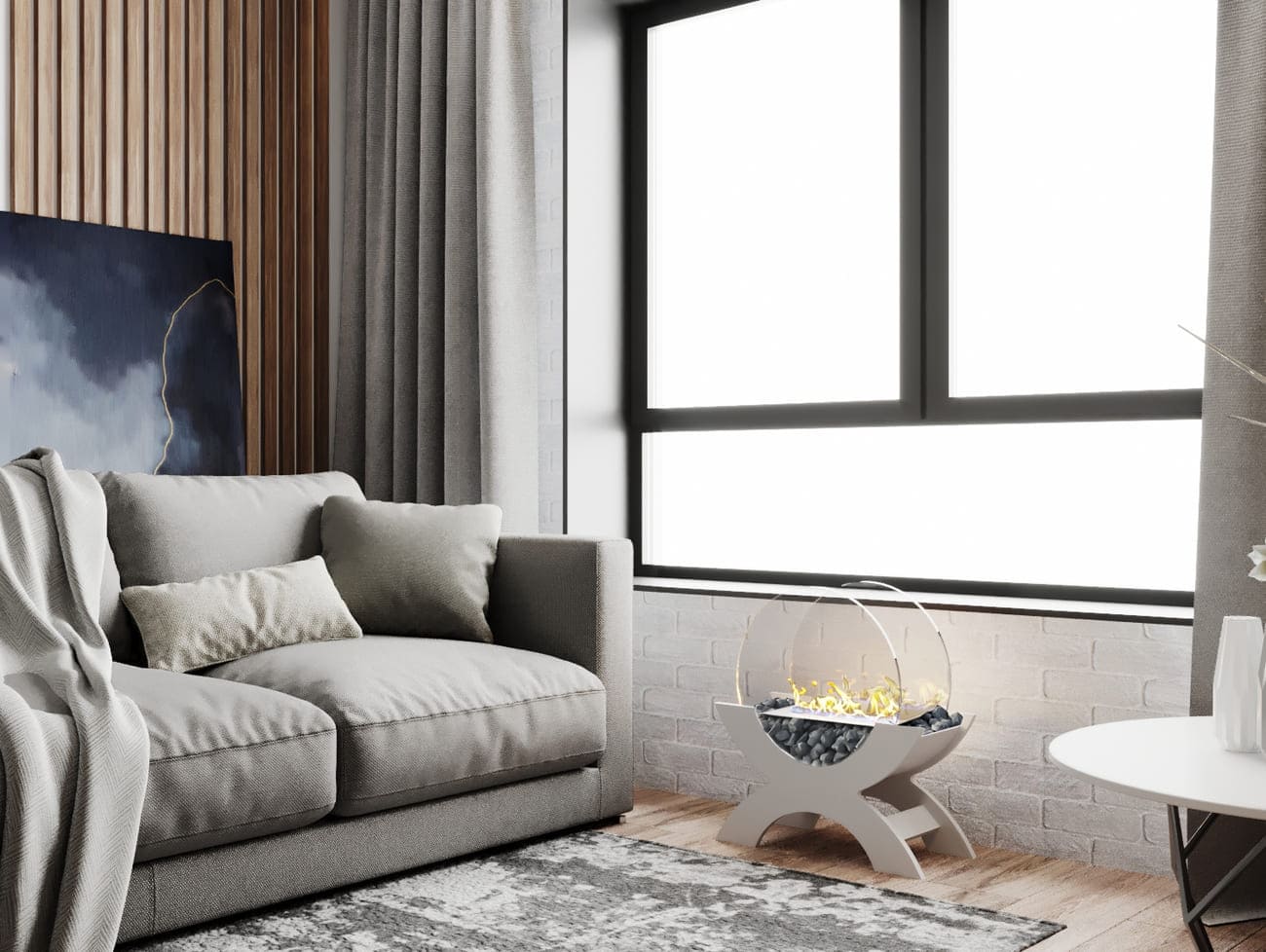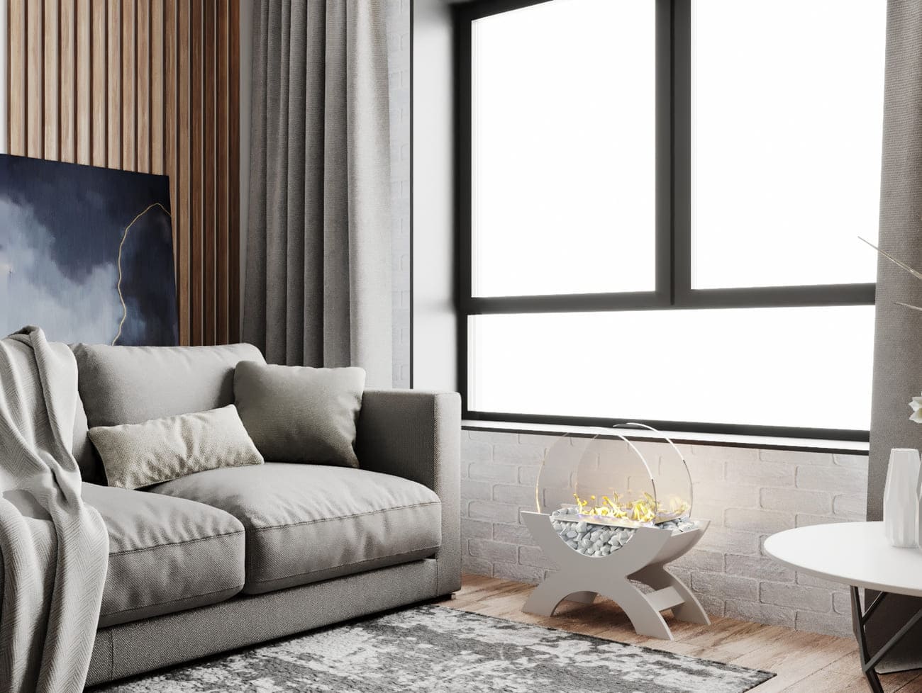 Переносной камин устанавливается на полу и не требует дымохода. Линия огня данного камина 300 мм, располагается практически по всей длине камеры сгорания. Основание биокамина — 100% сталь, ножки изготовлены из МДФ, топливный блок выполнен из высококачественной нержавеющей стали, наполнитель — керамическое волокно, а также закаленные жаропрочные стекла толщиной 6 мм, камни — галтованный мрамор.